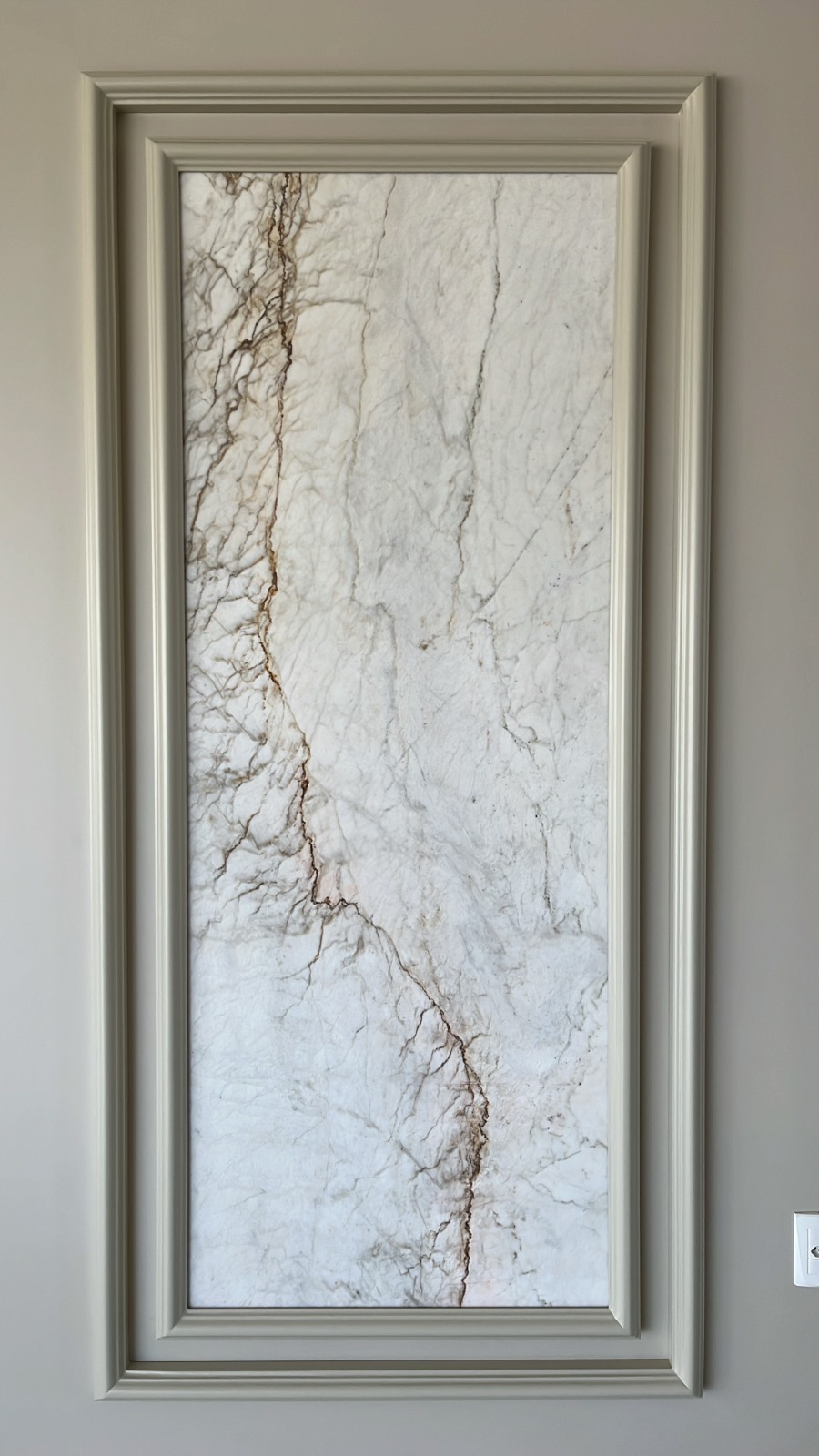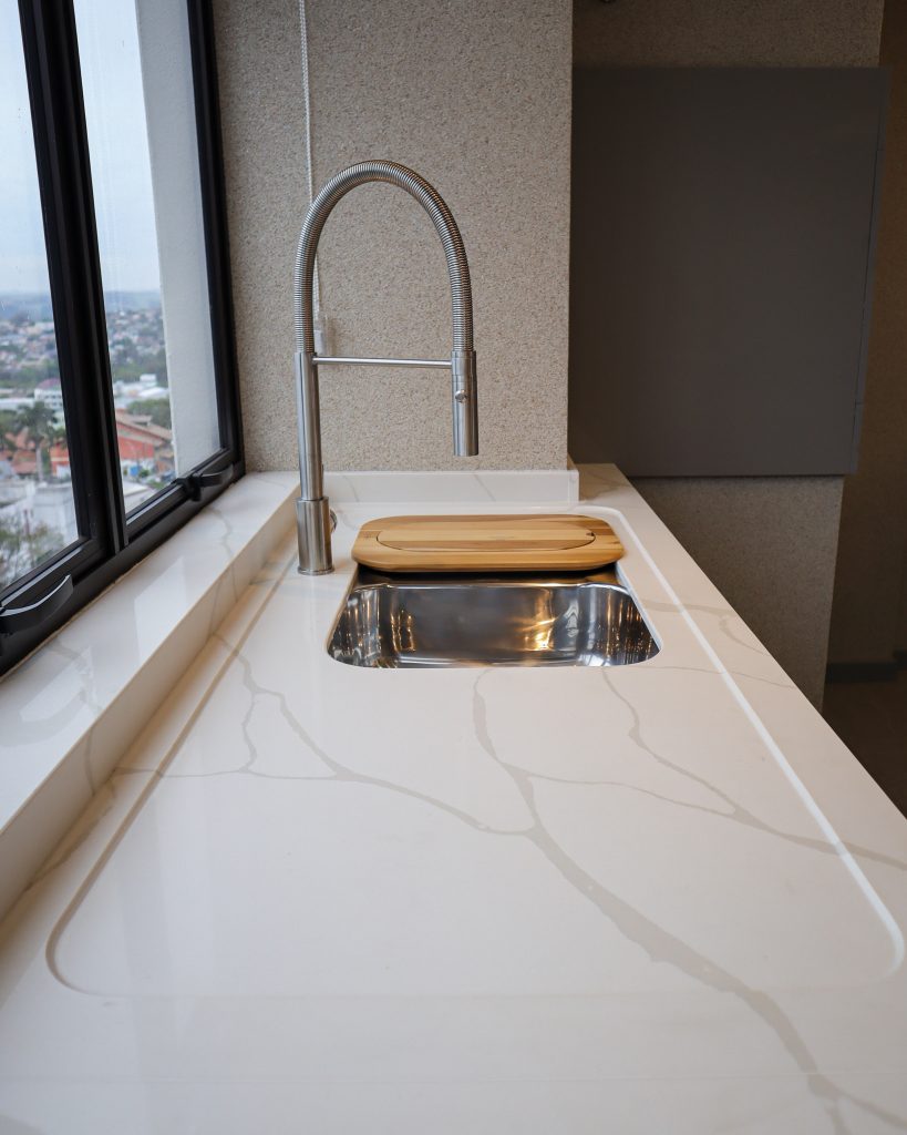 O Quartzito Mont Blanc, de tom claro e suaves veios acinzentados, trouxe leveza e elegância ao ambiente, tornando-se o destaque central do projeto.