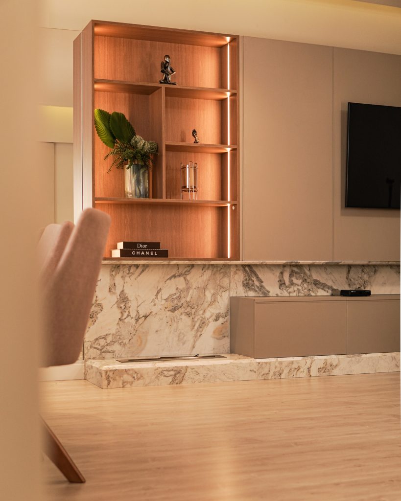 O projeto do apartamento da Leila nasceu a partir da decisão da pedra como elemento central. O mármore Matarazzo foi determinante para a escolha dos materiais, do layout e da forma de integrar os ambientes, valorizando a naturalidade e a elegância do conjunto.