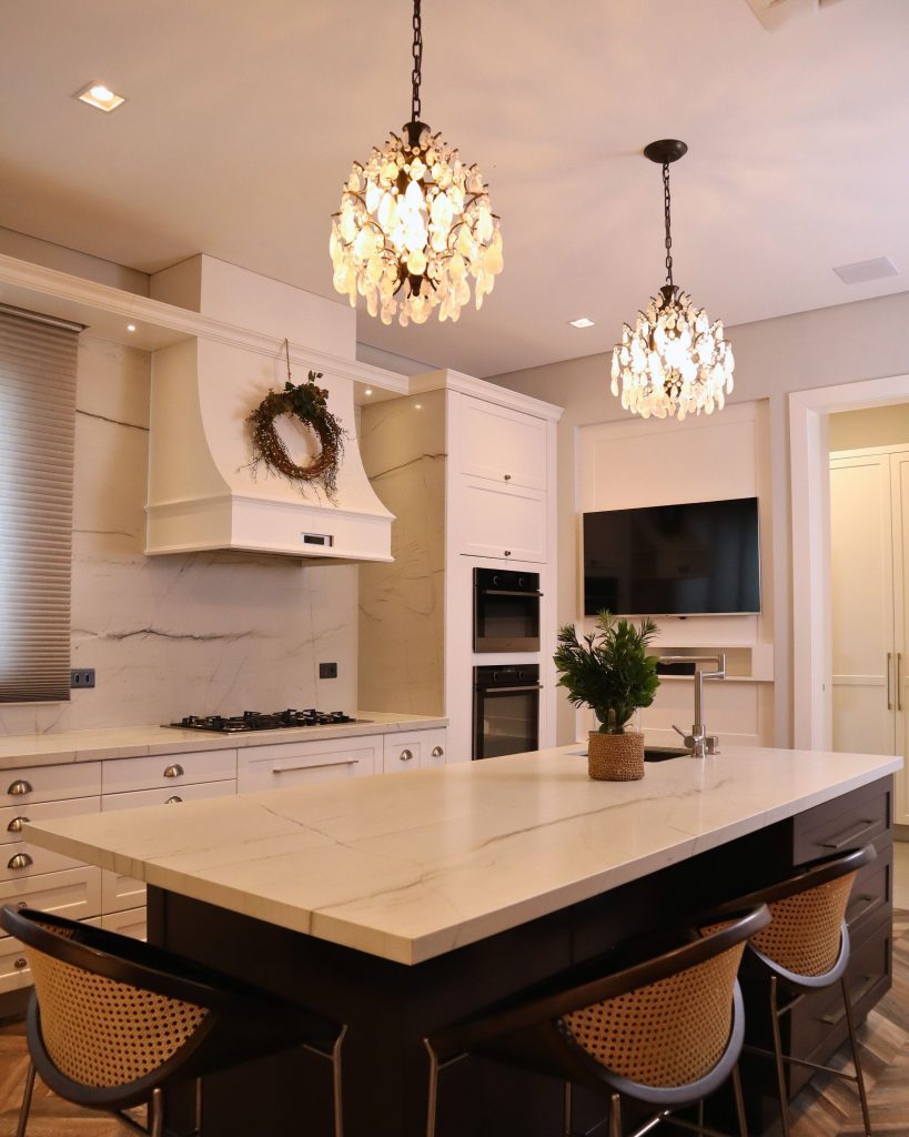 Esta cozinha foi projetada para unir funcionalidade e sofisticação, atendendo ao desejo dos clientes de ter um ambiente prático para o dia a dia e acolhedor para receber familiares e amigos.