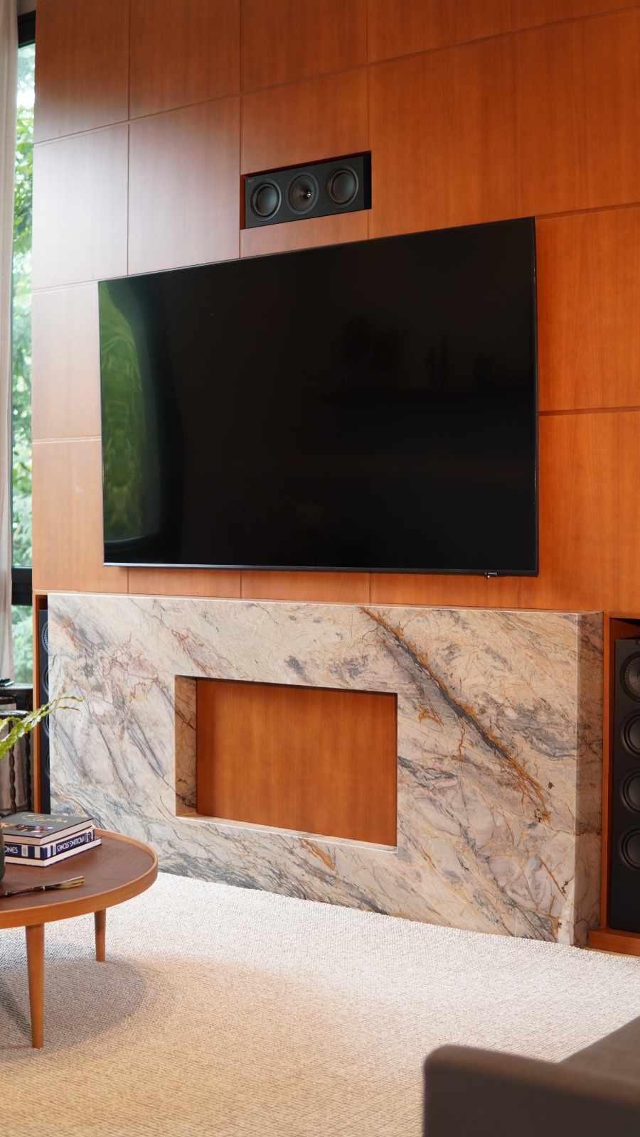 A paginação foi cuidadosamente estudada para posicionar os veios de forma estratégica, criando harmonia entre os tons dourados, o amadeirado da cozinha e a integração com a sala de estar e a lareira.